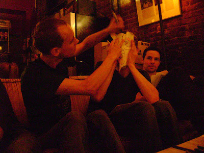 Some more artifacts from what will always be, at least in our hearts, the 51st State. Those are fro'd chickens hawking a swaddled baby.